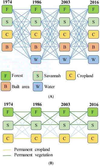 Since the purpose of our analysis was to understand the impacts of agriculture on natural vegetation, we combined trajectories considering forest and savannah as one natural vegetation class [13]. Likewise, all trajectories involving built areas and/or water were grouped under a single trajectory: “other”.