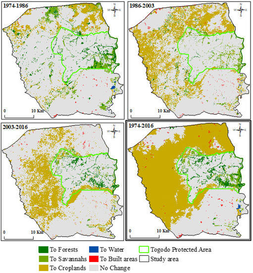 Historical LULC change in and around the Togodo Protected Area during the time intervals 1974–1986, 1986–2003, 2003–2016, and the temporal extent 1974–2016 (thick border).