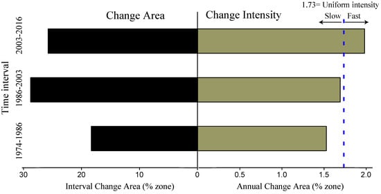 The results of time interval level intensity analysis (Figure 5) show that the annual change percentage (bars on the right of the central axis) was greater during the third time interval than during the second time interval, and during the second time interval than during the first. Land change was fast during the third time interval (1.98%) and slow during the first (1.53%) and second (1.69%) time intervals.