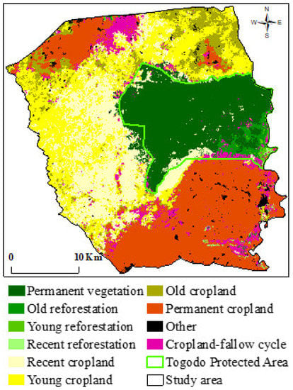 In Togo, natural vegetation has undergone significant change as a result of human activities such as agricultural expansion, illegal tree logging, and incursions in protected areas [13,17]. Similarly, the Togodo Protected Area (TPA) and its surroundings are experiencing near-daily human threats, including poaching, clearing for agricultural purposes, logging, and charring for domestic needs and sale. The subsequent changes over the past few decades led to the spread of many invasive plants that threaten the biodiversity of the TPA and add to the workload of local farmers [18]. Human pressure in and around the TPA forced the forest administration, in order to preserve the biodiversity conservation status, to proceed to the requalification of the TPA in February 2005. During this requalification, a consensual delimitation was carried out, and part of the protected area was returned to the population, who agreed to abandon the cultivated lands within the new boundaries of the TPA. These land use changes make TPA a suitable site for the assessment of land use change analysis methods. To ensure that the TPA continues to play its role in conserving biodiversity, it is necessary to better manage not only the surrounding lands but also plant invasions.