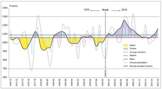 Based on the rainfall data, the average annual rainfall calculated during the growing season on a series of 49 years (1969–2018) is about 1061 mm (standard deviation: ±142 mm), with low inter-annual variability and a rainfall coefficient of variation of about 13%. Figure 8 shows the common discontinuities in the 1970–2018 time series, with alternating dry and wet periods with variable durations. The moving averages curve shows that there is a difference between the two periods: 1970–2000 and 2000–2018. The yearly rainfall trend after 2000 indicates that the annual rainfall was above the average for 18 years (2000–2018). Although this period displays a net increasing rainfall, the series of 49-years observed (1969–2018) are insufficient in terms of rainfall data to affirm a wet trend. However, our graph indicates that a drier trend does not seem to be affecting the Tabligbo region.