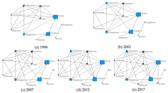 Tourism cooperation networks on China-ASEAN in 1998, 2002, 2007, 2012 and 2017.