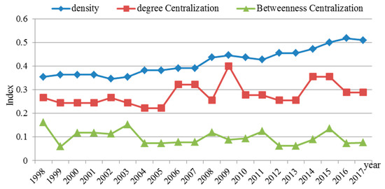 Centralization: The degree of centralization of the network has a fluctuating growth trend from 1998 to 2017, but it does not exceed 40%, indicating that there is not an obvious leader shown in this network. However, the betweenness centralization shows a fluctuating downward trend over the data period. It represents that the role of “intermediary” might not be as important as before. We argue that this essential finding might result from the role of direct cooperation being enhanced among countries, which might weaken the role of “intermediary” in this network.