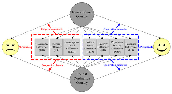 Based on the above analysis, the current study constructed the formation mechanism of tourism cooperation in China-ASEAN countries (Figure 3). We observed that political system difference, security difference, population density difference, and language difference jointly promote tourism cooperation. However, governance difference, income difference, and consumption level difference are obstacles for tourism cooperation presently.