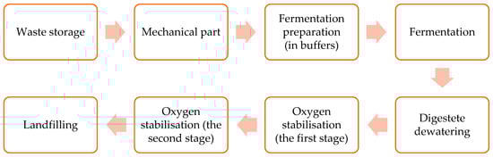 A modern waste management strategy should aim mainly at minimising waste generation (among others, by designing and manufacturing products that promote reuse and facilitate recycling and recovery), waste source separation and then reuse and recovery of energy and material resources from unavoidable waste []. The concept of “Zero Waste” is becoming more and more relevant by reducing the amount of waste, recycling, recovery, and minimisation of waste going to landfills [,]. However, literature data indicate that, still, unfortunately approximately 50% of municipal solid waste produced is sent to landfills []. Therefore, both the reduction of landfills volumes and the proper operation and reclamation of existing landfills are very important in terms of emission control (including the minimisation of uncontrolled biogas emissions). In this context, the mechanical-biological waste treatment in both aerobic and anaerobic conditions (at biogas plants) has its full justification []. The biological process of methane fermentation is very complex and multiphase. In the last decade, devices for controlling individual process phases, as well as analytical tools, have been developed. These changes have contributed to increasing the energy efficiency of the process. The goal of the control system is to optimize the entire biogas production process and provide early warning to prevent failure of the entire process []. Thanks to the development of control and analysis systems, biogas plants can operate smoothly despite these extremely complex steps [].
