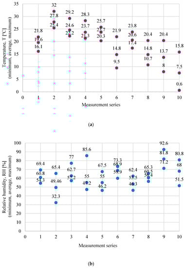 Minimum, average, and maximum temperature (T) (a) and relative humidity (RH); (b) at individual measurement series.
