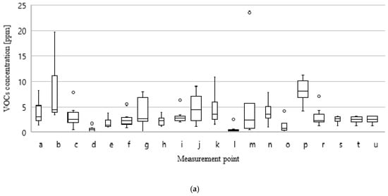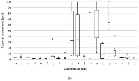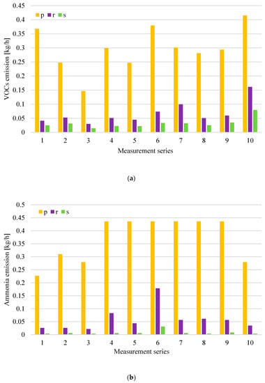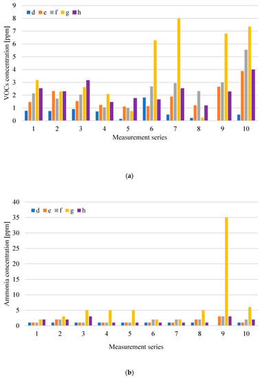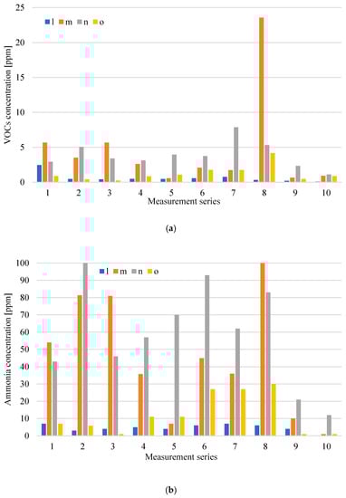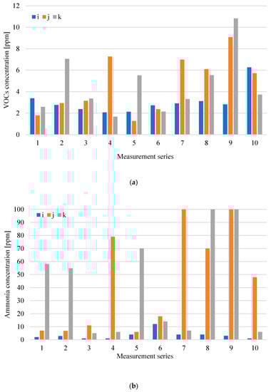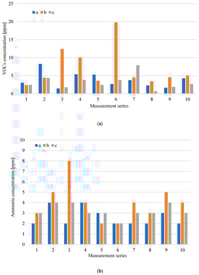 Figure 10a,b shows the distribution of concentrations of VOCs and ammonia for all measurement points in the ten measurement series.