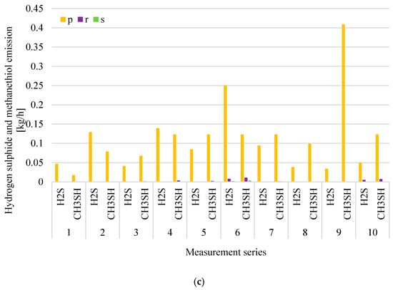 Distributions of volatile organic compounds (VOCs) (a), ammonia (NH3); (b) and hydrogen sulphide (H2S) and methanethiol (CH3SH); (c) emission at the waste storage plant in particular measurement series (p-roof ventilator 1-process gases captured from over-mixed waste; r-roof ventilator 2-process gases captured from the overhead conveyor transporting waste to the sorting plant; s-roof ventilator 3-process gases captured from over selectively collected waste).