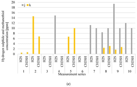 Figure 6a–c shows the distribution of measuring odorant concentrations for the digestate dewatering plant, while Figure 7a,b presents the distribution of emission levels in individual measurement series from roof ventilators, which are at the digestate dewatering plant.