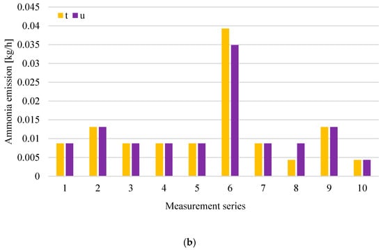 Distribution of VOCs (a), NH3; (b) emission at digestate dewatering plant in particular measurement series (t-roof ventilator 4–inside the hall; u-roof ventilator 5–inside the hall).
