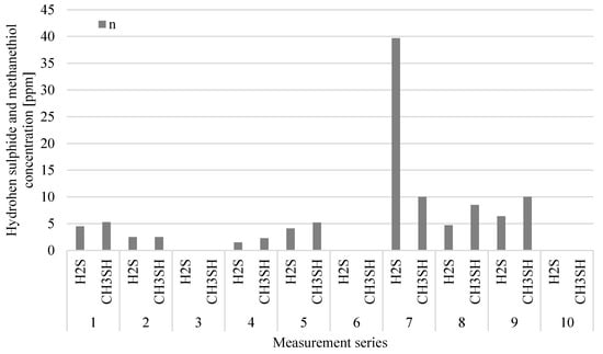 The concentration of hydrogen sulphide and methanethiol at the measurement points related to digestate dewatering varied during individual measurement series, reaching maximum values of 19.4 ppm (in series 9) and 10 ppm (in series 5, 9 and 10), respectively.