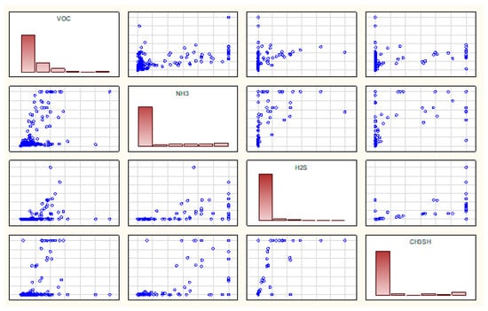Figure 11 shows the correlation matrices for the odorants tested. Along the diagonal of the matrices, there are histograms representing the distribution of values of each variable. Table 5 shows the correlation coefficients based on Figure 11.
