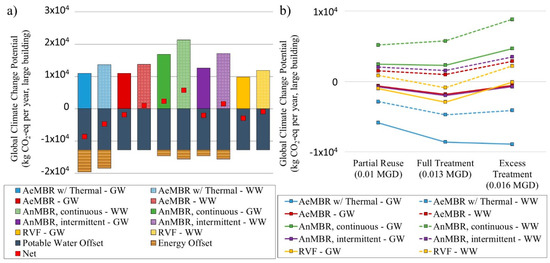 Global warming potential of NPR systems: (a) shows results across systems for Scenario 2, where treatment volume is equal to non-potable demand. Results include operation and infrastructure impacts (positive) and applicable avoided product credits (negative). Red squares indicate net impacts; (b) shows net impacts across Scenarios 1 through 3, where Scenario 2 (Full Treatment) corresponds to the net impacts illustrated in Figure 5a. GW = graywater and WW = wastewater.