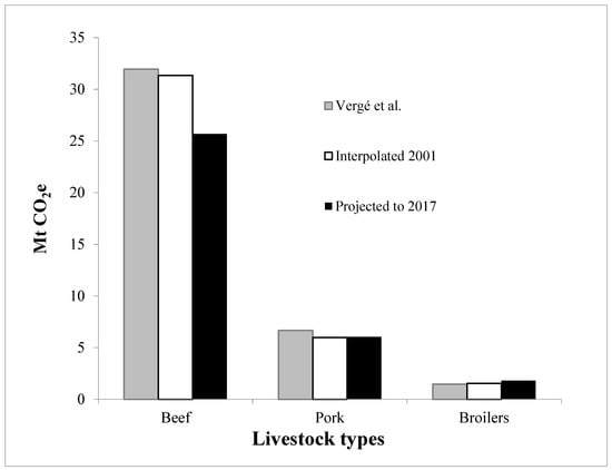 Figure 1 shows the GHG emissions based on the metamodel described by Dyer et al. [] for the 2001 production (P) of the three livestock commodities (white bars) in comparison to the 2001 production-related GHG emission estimates [,,] (grey bars). Figure 1 also shows the 2001 GHG emissions projected to 2017 (black bars) based on the GHG metamodel []. As expected, the differences between the two sets of estimates for 2001 were very small relative to the differences among the three carcass types. For pork and broilers, there was almost no change from 2001 to 2017, based on the metamodel []. For beef, the metamodel [] projected about a 20% decrease from 2001 to 2017, based on a decline in the Canadian beef cattle population over that period [].