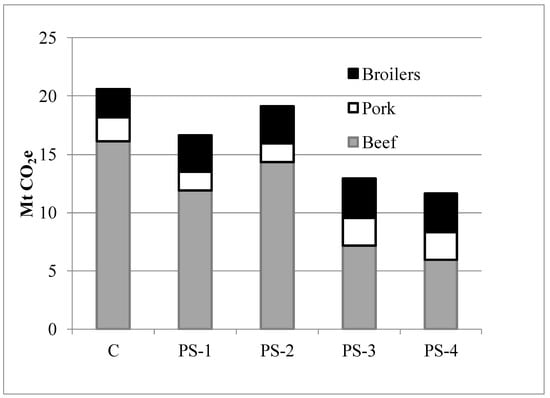 With the focus on consumer options, the reference quantity for this analysis was animal protein consumption (C), rather than P. The GHG emissions for the 2017 C and for each PS are shown in Table 2. For each PS, the GHG emission total includes all three livestock types. Agriculture and Agri-food Canada [] provided carcass weights (CW) for Canadian consumption of all three carcass commodities for 2017. These CW data were converted to LW using coefficients from Dyer et al. []. The CW data for beef and pork consumption [] were within 5% of the estimates of the Canadian consumption of these two commodities from the Organization for Economic Co-operation and Development (OECD) []. Dyer et al. [] used the LW ratios of C to P for each commodity to interpolate the GHG emissions associated with C from the GHG emissions for P for each livestock type [,,].