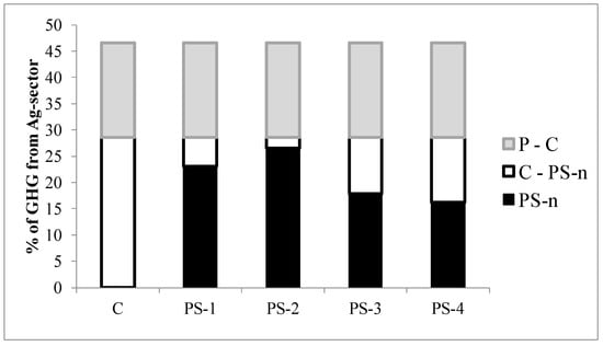 The PS-related GHG emission reductions from C are shown in Figure 3 by the white segments of the four bars for PS. PS-4, the most effective of the four scenarios, would reduce the sector-wide GHG emissions by 12.4%, with PS-3 reducing the sector-wide GHG emissions by 10.7%. PS-2, the least effective of the four scenarios, would only reduce the sector-wide GHG emissions by 2.0%, while PS-1 would reduce the sector-wide GHG emissions by 5.4%. The white segments of the four PS bars in Figure 3 illustrate graphically the ΔPS-n calculations in Table 2.