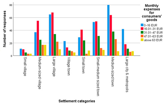 Based on these monthly expenditures on local producers’ goods, we examined the consumers as separated groups. We compared these groups based on the demographic characteristics and purchasing habits of the customers. The majority of the sample consisted of women; however, there was no statistically significant correlation between the gender of the respondent and the monthly expenditure on local producers’ goods. Marital status also did not cause significant differences between the groups examined on the basis of monthly expenditures (Table 2). These results are not related to the results presented in the “Literature review” that consumers preferring local products are mainly women [46,47,48] or those who have a family [50]. An important note is that our survey did not examine the number of children of consumers. The survey included a question on the number of people living in one household, but it was not possible to identify the given persons. For this reason, there is no information on whether responders have children or not. Therefore, we could not support or reject Bakos’s [44] experience that mothers with small children are also significant (potential) consumers of local food. According to our results, the number of people living in single households was positively correlated with monthly expenditures on local producers’ goods only in the case of an 8% significance level. Therefore, the strength of this relationship is weak (value of Cramers’ V association: 0,086).