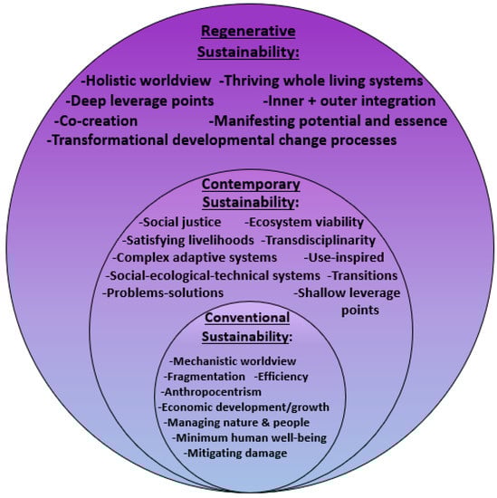 “Regenerative sustainability” has been called the next wave of sustainability [41,42], and it represents a necessary worldview and paradigm shift for sustainability [4,10,18]. It includes and transcends conventional and contemporary sustainability, adopting a holistic worldview (Figure 1) [34,43]. A holistic worldview, rather than being fixed, fosters the ability to integrate and transcend paradigms, which is the deepest leverage point in systems and, thus, absolutely necessary for sustainability [4,18,44,45]. Regenerative sustainability sees humans and the rest of life as one autopoietic system in which developmental change processes manifest the unique essence and potential of each place or community. Regenerative sustainability’s aspirational aim is to manifest thriving and flourishing living systems (i.e., complex adaptive systems) in the fully integrated individual-to-global system. It calls for humans to live in conscious alignment with living systems principles of wholeness, change, and relationship, as nature does [4]. The belief that this is possible and a logical, necessary, and desirable aim is based on recent scientific understandings in ecology, quantum physics, systems theory, developmental change theory, psychology, neuroscience, design, planning, and sustainability, as well as more ancient ways of knowing and being in the world (i.e., indigenous knowledge and practices, eastern spiritual traditions, and philosophies) [4,34].