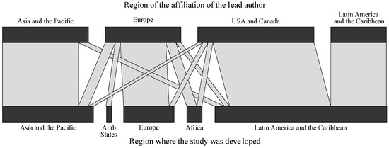 The first authors of the analyzed papers have affiliations in Europe and North America (57.6%), Asia and the Pacific (25.7%), and Latin America and the Caribbean (16.7%). The relationship between the author’s affiliations and the region where the study was developed is represented in Figure 1. Authors from Europe and the USA and Canada have developed studies in a diversity of MAB regions. About 87% of the research from lead authors from USA or Canada is developed in the Latin America and the Caribbean, and none in their own biosphere reserves. Authors from Europe, Asia and the Pacific, and Latin America and the Caribbean have developed studies mainly in their own respective regions.