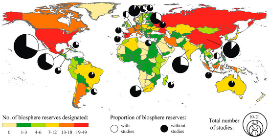 Number of biosphere reserves designated in relation to the number of case studies reviewed by country. The proportion of biosphere reserves with studies vs. without studies by country is represented, respectively, by the white and black fill of the circles. The size of the circle represents the total number of studies by country. Each country is colored according to the number of biosphere reserves designated.