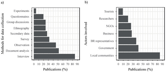 Proportion of the papers in relation to: (a) the methods used for data collection; (b) the actors involved in data collection. MAB—Man and Biosphere Program; NGOs—Non-governmental organizations.