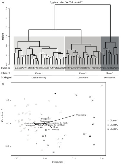 Cluster analysis of the scientific literature about biosphere reserves’ management effectiveness: (a) dendrogram showing three groups of papers; (b) the three groups of papers in a multidimensional scaling (MDS). Only the variables that are significantly correlated with the dissimilarities among papers are represented: methods used for data analysis and MAB region.
