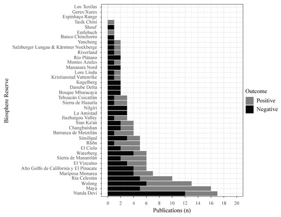 From the 66 papers analyzed, 43 report at least one positive outcome; 49 at least one negative outcome, and 32 both positive and negative outcomes. The number of papers that report environmental, economic, cultural and social positive and negative outcomes in each biosphere reserve is represented in Figure 5. For most of the biosphere reserves, both positive and negative outcomes were reported.