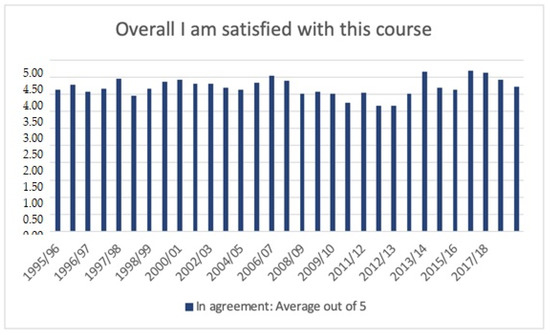 Average answers to survey of student satisfaction for the course over the last 15 years.