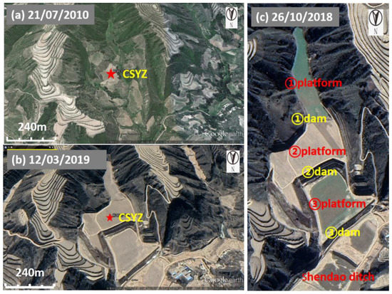 Chunshuyaozi (CSYZ) gully is located in Chunshuyaozi village, Louping town, Ansai district, Yan’an city, Shaanxi Province, and is where the GLC project was implemented in 2013. After the farmland construction was completed in one year, the farmland was immediately planted. So far, it has been five years since CSYZ farmland was backfilled. Figure 1a,b shows satellite images of CSYZ before and after the GLC, taken on 21 July 2010 and 12 March 2019, respectively. Through comparison, it was found that the morphology of these slopes and trenches changed significantly after excavation and backfill.