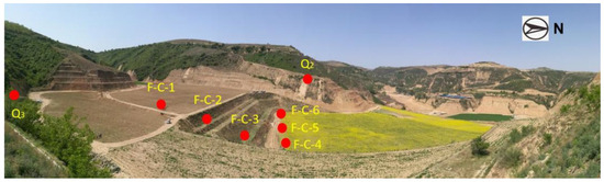 Loess soil samples were taken from 14 sampling sites of the excavated slopes and the backfilled farmlands in the study area, eight sites in the CSYZ gully, and six sites in the SJG gully. Two parallel samples were taken from each site. For the CSYZ gully, the sampling site labeled Q3 is Q3 loess located in the middle-upper part of the southern slope, which is about 15 m from the crest of the slope in the vertical direction and 1 m from the slope surface in the horizontal direction. The sampling site labeled Q2 is Q2 loess located in the lower part of the western slope, which is about 55 m from the crest of the slope in the vertical direction and 1 m from the slope surface in the horizontal direction. The sampling sites labeled F-C-1 to F-C-6 are backfilled loess, and samples were taken from about 0.5 m depth. Among them, F-C-1 is on the northern side of the second-level farmland, F-C-2 and F-C-3 are on the middle-upper and lower part of the secondary dam, respectively, and F-C-4 to F-C-6 are on the southern side of the three-level platform, from east to west (Figure 3).