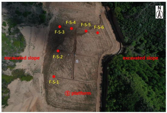 For the SJG gully, sample sites labeled F-S-1, F-S-2, and F-S-3 are located on the west side of the fifth-level platform, respectively, from south to north, and sample sites labeled F-S-4 to F-S-6 are on the south side, from west to east. The sampling depth was about 0.5 m (Figure 4).