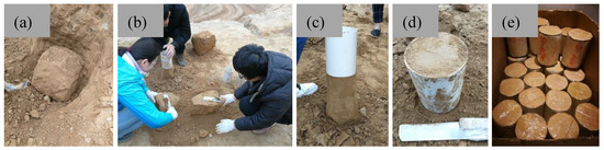 All soils were sampled by an undisturbed sampling method. Through experience, we found that the advantages of PVC sampling cylinders are that they are sealable, impervious, and lightweight compared to traditional iron cylinders. PVC pipes were cut into short tubes 16 cm in height and 11 cm in diameter in advance. Cardboard plates 11 cm in diameter were made from cardboard boxes to be used as caps for the PVC tubes. The sampling process and method are as follows (Figure 5): First, about the top 0.5 m surface layer was removed at the sampling site, and the soil was excavated to make an intact soil block about 25 × 20 × 20 cm (Figure 5a,b). A PVC tube was placed on top of the soil block and gently pushed into the block while the surrounding soil was trimmed off (Figure 5c,d). Then, multiple layers of preservative film were used to completely seal the PVC tube in order to preserve the soil moisture from evaporation loss. Cardboard plates were taped to both ends of the tube to secure the soil sample and prevent disturbance (Figure 5e). The tube was marked with the sample number and placed in a box to be transported to the laboratory.