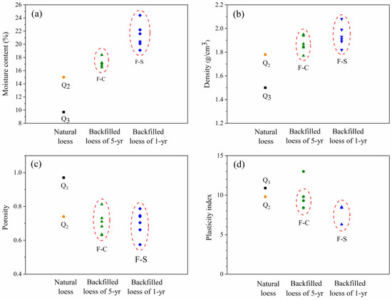 On the contrary, the porosity of backfilled loess is significantly lower than that of natural loess (Figure 6c). The porosity ratio of Q3 and Q2 is 0.97 and 0.74, respectively. The porosity ratio of F-C varies from 0.63–0.81, and that of F-S ranges from 0.58 to 0.79. The mean porosity of F-C increased compared with that of F-S. Similarly, the plasticity index of backfilled loess is also lower than that of natural loess from slopes (Figure 6d). The values of F-C samples are mainly distributed in the range of 8.4–9.8, while the values of F-S samples have an obvious decrease and are mainly distributed in the range of 6.3–8.5.