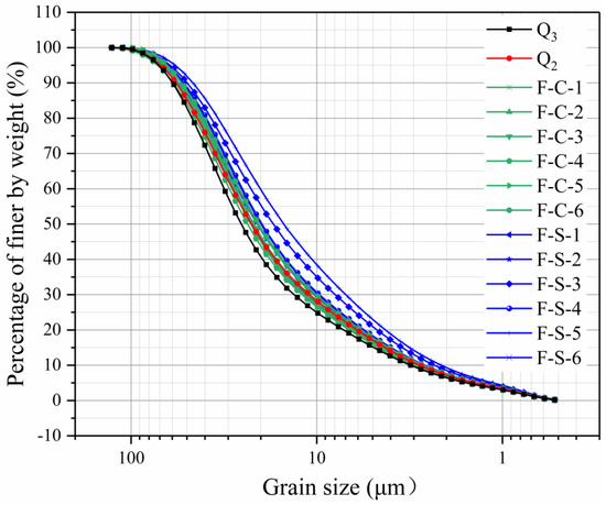 Figure 7 shows the results of grain analysis tests. It can be seen that the grain size accumulation curves of 14 samples is smooth and continuous, with a granularity distribution ranging from 0.523 μm to 111 μm. Among all curves, Q3 is located on the far left of the graph, Q2 and F-C are mostly concentrated in the middle part, and F-S is mostly distributed on the right. It can be seen from Table 2 that Q3 has four maximums of characteristic grain size indices, d60, d50, d30, and d10. Overall, although there are no significant differences, the indices of SJG are slightly higher than those of CSYZ.