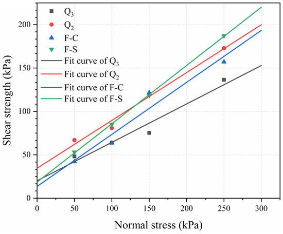 Normal stress–shear strength curves of Q3, Q2, F-C, F-S samples.