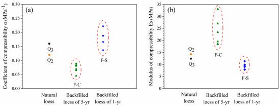 Using coefficients of compressibility and modulus of compressibility as criteria to evaluate the compressibility of soils, it can be found that loess of Q3, Q2, and F-S has an intermediate level of compressibility, and F-C is at a low level (Table 4). The porosity ratio of F-S is lower than that of Q3, but compressibility is greater (Figure 9), indicating that the compressibility of soil is related not only to the total pore volume, but also to the age and water content of the soil, the shape of soil particles, the strength of soil skeletons, and the pore distribution. Therefore, it is necessary to further study the microstructural characteristics of loess.