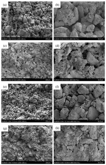 The SEM tests indicate that the microstructure of Q3 loess is loose, with clear grains and outlines (Figure 10a,b). The shape of the grains is granular, and surfaces presented with friable minerals. The particles mainly had point-to-point contact with each other. The intergranular pores are developed, in which scaffold pores are predominant, and the connectivity among pores is pretty good (Figure 10a,b). Compared to the structure of Q3, the structure of Q2 loess is much denser, and the particle outlines are blurred. The particle forms mainly include aggregates and clots, and surfaces are mainly cemented face-to-face. The pores of Q2 are reduced, and most are mosaic and intra-particle pores (Figure 10c,d). The grain distribution of the F-C backfilled loess is more uniform, and its structure is denser than that of the Q3 loess. The aggregated clay particles are mainly attached on the surfaces, showing that soil particles tended to be rounded when softened by water. The particles have both point-to-point and face-to-face contact patterns. F-C is dominated by mosaic pores and a small number of scaffold pores. It can be seen that some small particles filled in the large gaps (Figure 10e,f). The structure of the F-S backfilled loess is also dense, while the grain distribution is not uniform. Similarly, the aggregated clay particles are mainly attached on the surfaces, and the particles have both point-to-point and face-to-face contact patterns. There are more mosaic and intra-particle pores. High magnification shows that there is structural damage among the soil particles, and some flocculent particles caused by water softening filled into the pores (Figure 10g,h).