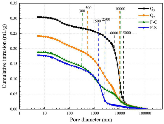 Cumulative intrusion vs. pore size of Q3, Q2, F-C, and F-S samples.