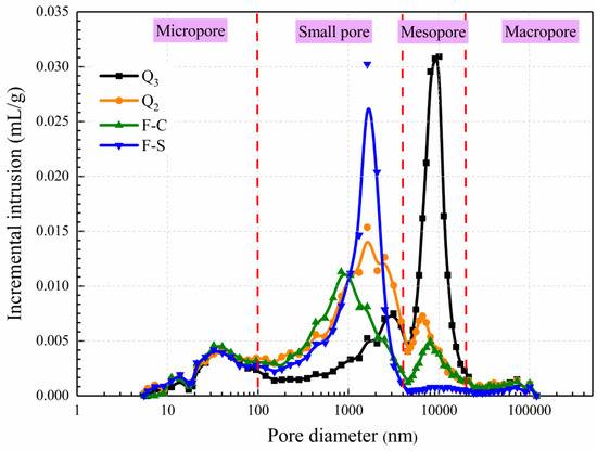 Pore size distribution curves of Q3, Q2, F-C, and F-S samples.