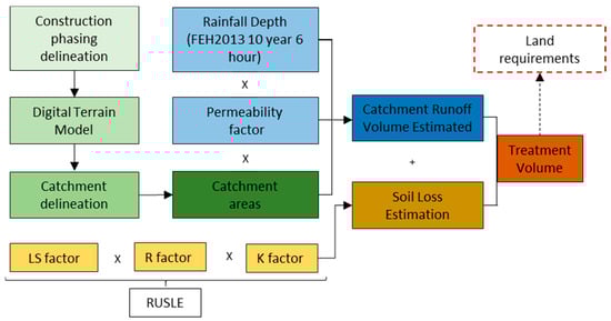 The required land within each drainage catchment to accommodate construction drainage has been estimated using treatment volume (Equations (2) and (3)).