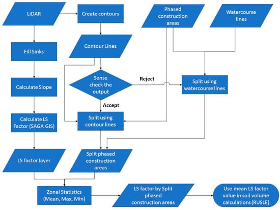 A methodological framework (Figure 2) has been developed to meet the requirements of the environmental regulator. The framework has been used to estimate the required capacity of construction drainage features, to inform the allocation of space required during construction. Owing to the processes underpinning the development of the LS factor, the methodological process used is illustrated separately (Figure 3).