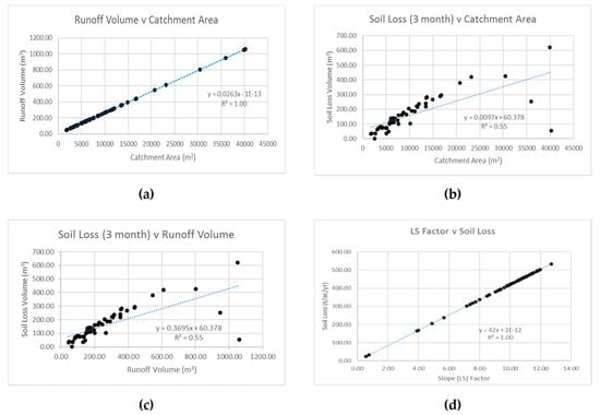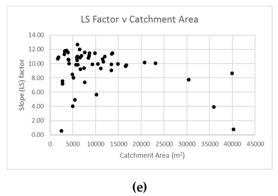 Basic statistical analysis has been undertaken to determine the relationship between inputs of the methodological framework and to identify potential areas of weakness in the methodological process (Figure 4). This indicates that runoff volume is positively correlated with catchment area (r2 = 1) (Figure 4a) which is to be expected considering a universal runoff coefficient has been applied across all catchments. This linear relationship does not exist when comparing soil loss and catchment area and runoff volume (Figure 4b,c). When catchment area exceeds 25,000 m2, the corresponding soil loss volumes are lower than expected for three catchments. As the RULSE input parameters were universal, with the exception of the LS factor, this suggests that the discrepancy may be attributed to the catchment specific LS factor or another contributing factor. Examination of the LS factor indicates a positive correlation (Figure 4d) (r2 = 1) with annual soil loss increasing with higher LS factors, which has been reported in other studies [24]. However, this does not account for the unexpected results shown in Figure 4b,c. A possible explanation for this could be the relatively lower LS factors for the catchments with areas exceeding 25,000 m2, which could account for the below expected soil loss volumes in the larger catchments. For example, the LS factors for the catchments exceeding 25,000 m2, which do not follow the linear relationship, are 7.74, 3.9 and 0.76 are below the mean LS value for all catchments, which is 9.5. When comparing the LS factor and catchment area (Figure 4e), it has been demonstrated that the LS factors within comparable catchment areas vary with the higher LS factors generally attributed to smaller catchments.