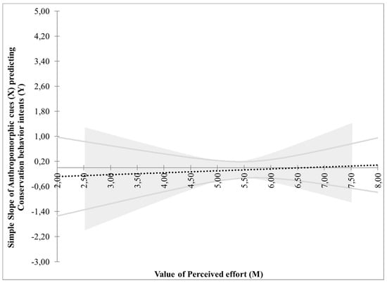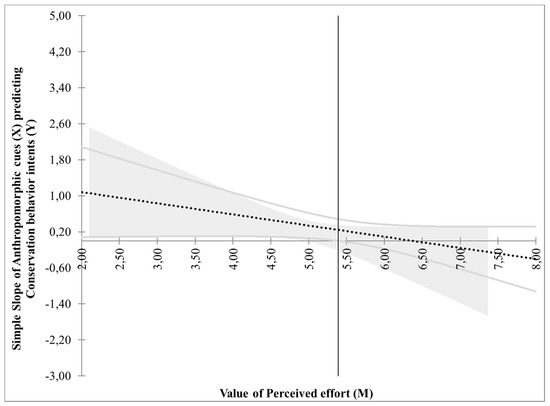 Next, we ran a Johnson and Neyman’s test [74] to inspect the nature of the relationships between variables. When a message was framed as a loss, there was found a significant interaction between anthropomorphic cues and perceived effort (B = −0.24, SE = 0.10, t = −2.36, p = 0.01). Specifically, the higher the effort associated with a given conservation behavior, the stronger the effect of anthropomorphic cues (the Johnson–Neyman significance region was identified as below point 5.38 on a 7-point scale, where 7 indicated low effort and 1 signified high effort; see Figure 1). Nevertheless, when a message was framed as a gain, there was no interaction between anthropomorphic cues and perceived effort (B = 0.06, SE = 0.11, t = 0.53, p = 0.59; see Figure 2), and there was only found a significant effect of perceived effort i.e., the lower the effort, the higher probability for one to engage in a particular behavior (B = 0.36, SE = 0.07, t = 4.67, p < 0.01). Hypothesis H2 is, therefore, supported.