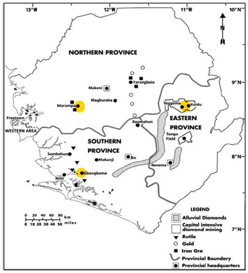 - Bermúdez-Lugo, O. The mineral industry of Sierra Leone. Miner. Yearb. Area Rep. Int. Rev. 2012 Afr. Middle East 2015, 3, 33. [Google Scholar]