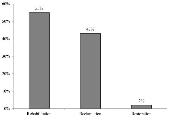 Restoration, on the other hand, was also recommended, but by only 7 (2%) respondents to enhance environmental conservation around mining sites (Figure 2). Restoration’ is ‘the process of recovery of an ecosystem that has been degraded, damaged or destroyed, returning it to its original state. Restoration operation enables no flexibility in land use and entails the most substantial cost []. The primary concern in restoration is subsequent guidelines for land use and whether the return to pre-disturbance use is the best use of land. To extract better results on restoration, Kitula [] stresses that environmental factors must be taken into consideration while selecting plant species for restoration. These include their soil organic matter and available soil nutrients, and capacity to stabilize the soil. Therefore, the restoration of land to the best land use for future generation by using modern technologies is decisive in the study areas.