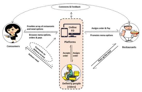 O2O services have emerged in various fields, including the purchase of diverse product and service categories, such as food, hotel rooms, real estate, or car rentals [10]. Online FD refers to the process whereby food that was ordered online is prepared and delivered to the consumer. The development of online FD has been underpinned by the development of integrated online FD platforms, such as Uber eats, Deliveroo, Swiggy, and Meituan. Online FD platforms serve a variety of functions including providing consumers with a wide variety of food choices, the taking of orders and the relaying of these order to the food producer, the monitoring of payment, the organization of the delivery of the food and the provision of tracking facilities (Figure 1) [11]. Food delivery applications, or ‘apps’, (FDA) function within the broader context of online FD as they enable the ordering of food through mobile apps [12].