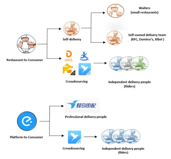 Online FD requires highly efficient and scalable real-time delivery services. Restaurants can use existing staff for self-delivery, such as the use of waiters in some small restaurants or they may use specialized delivery teams who are specifically employed and trained for this role, as is seen with some of the big restaurant brands, such as KFC, Domino’s, and Xibei. Alternatively, restaurants can employ crowdsourcing logistics, a network of delivery people (riders) who are independent contractors, a model that provides an efficient, low-cost approach to food delivery [14]. Online FD platforms can either be responsible for recruiting and training professional delivery people, or they may also resort to crowdsourcing logistics, using delivery people who are not necessarily employed by the online FD platform. Professional delivery people are usually trained, and at least part of their salary is guaranteed, while a portion is commission-based. In contrast, the independent delivery people who are frequently known as “riders” are paid on a commission (per order) basis (Figure 2).