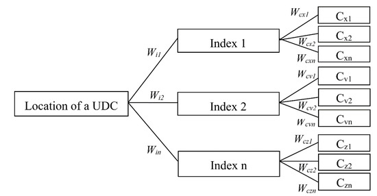To develop the structure of the multiple hierarchical decision, the criteria are needed to be established for the UDC. This generic structure (see Figure 1) can be applied to any location (i.e., further alternatives), considering different criteria according to the specificities of a city. Figure 1. Shows, from the hierarchical decision structure, the goal of the problem’s decision which is where to locate a UDC, with several criteria (Cx, Cv, Cz) assembled into their indexes.