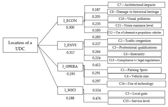 Figure 2. shows a decision hierarchy structure with normalized weights for the indexes and respective weights of variables. The results of the normalized weights for the indexes show the relevance of economic and environmental aspects for sustainable UDC implementation. Similarly, the statements of Reference [21] highlight the importance of reduction of atmospheric/air pollution, noise nuisance levels and visual intrusion for those decisions. The structure also reveals the prevalence of the local prosperity compared to service level, as described by Reference [5]. Peculiarly, this finding is also related to the reduction of local insecurity [39], provided by the uncontrolled acts of loading and unloading that are prohibited in the city center, recklessness of the drivers and large vehicle traffic.