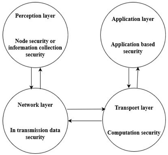The Internet of Things (IoT) leads to a revolutionary change in the lifestyle of users [1]. Every device that is connected to the IoT works in a smart way to make the world technology-dependent [2]. IoT works in numerous applications, such as inventory, health care, and smart homes [3]. Therefore, users expect a high level of security and privacy from the IoT, requiring a security framework [4]. The inbuilt security solutions in the IoT are susceptible to attacks, such as denial of service (DoS), spoofing, and many more [5]. A security framework is evaluated by assessing its security features, such as authentication, or confidentiality in this case [6,7]. The next step for evaluating a framework is to check whether the data collected are authentic or not [8]. The last evaluation measure for a security framework is the synthesis or mining of data to make fruitful decisions. A security framework can be competent if it can meet the security requirements and can make decisions efficiently in real-time [9]. A security framework tends to provide overall system security. As shown in Figure 1 below, there are four operation layers in the IoT. These four layers—that is the perception, network, transport, and application layers—take care of the security implementation at different levels.